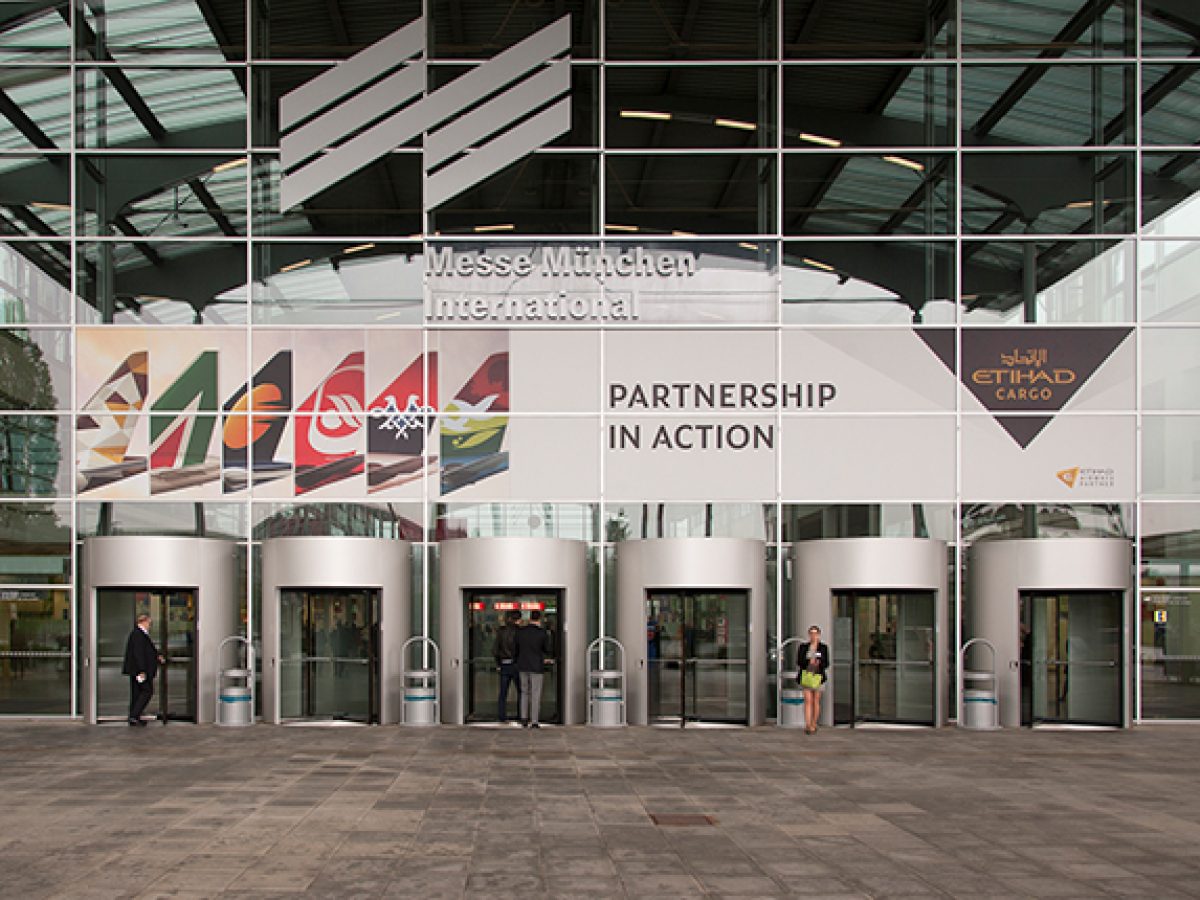 Facade billboards above rotating entrance doors